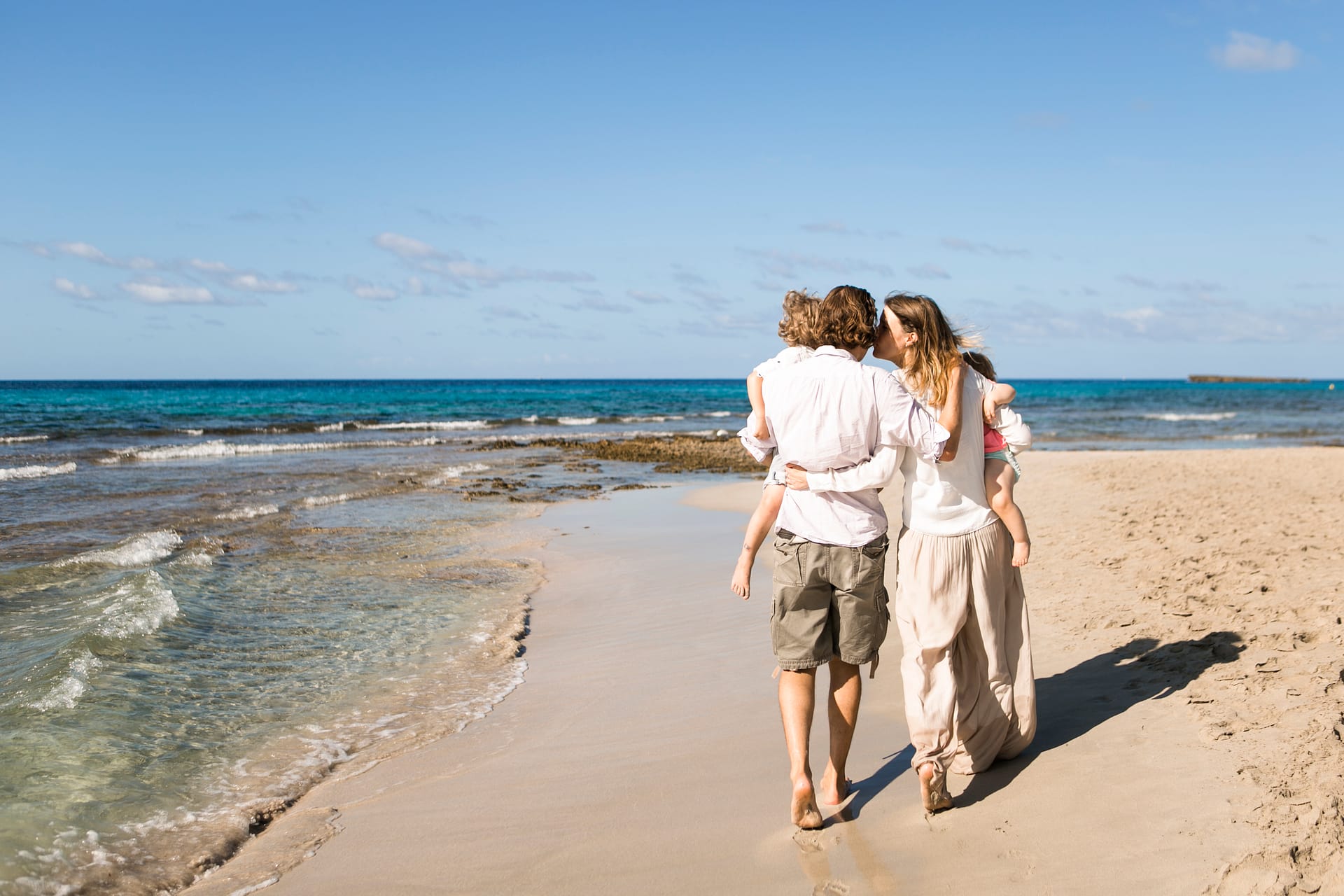 Familie mit zwei Kindern auf den armen der Eltern laufen am Strand.
